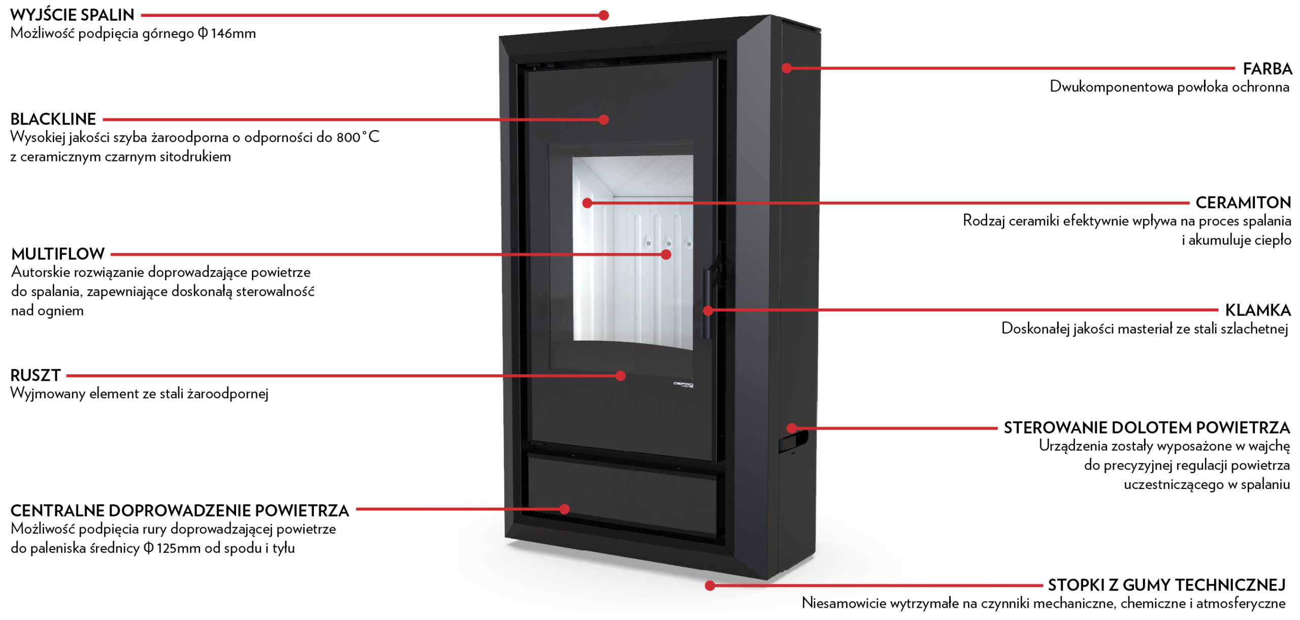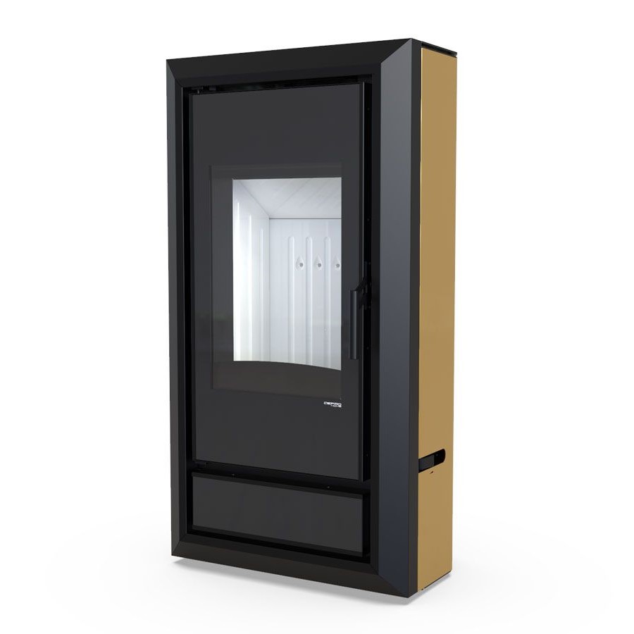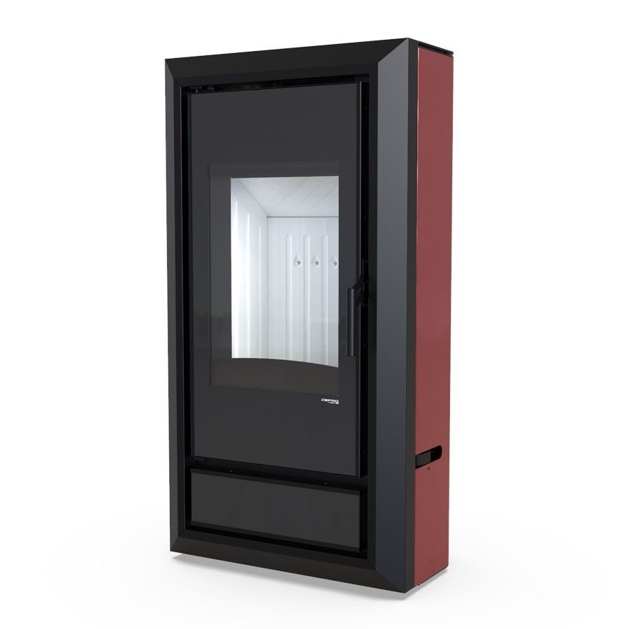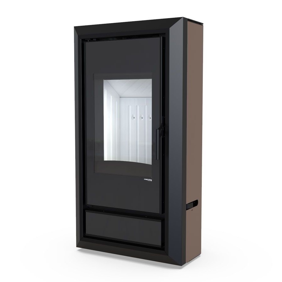 Wertykalnie położona szyba drzwi pozwala wydobyć piękną wizję ognia. Efektowne zagięcia na froncie piecyka tworzą ramę wokół widocznego paleniska, dające całości ciepłego wrażenia. Nowoczesna i zwarta obudowa podkreśla piękno i funkcjonalność tego modelu. Możliwość doprowadzenia powietrza do paleniska od spodu i tyłu pieca. Możliwość wypoziomowania pieca od 20 mm do 40 mm.