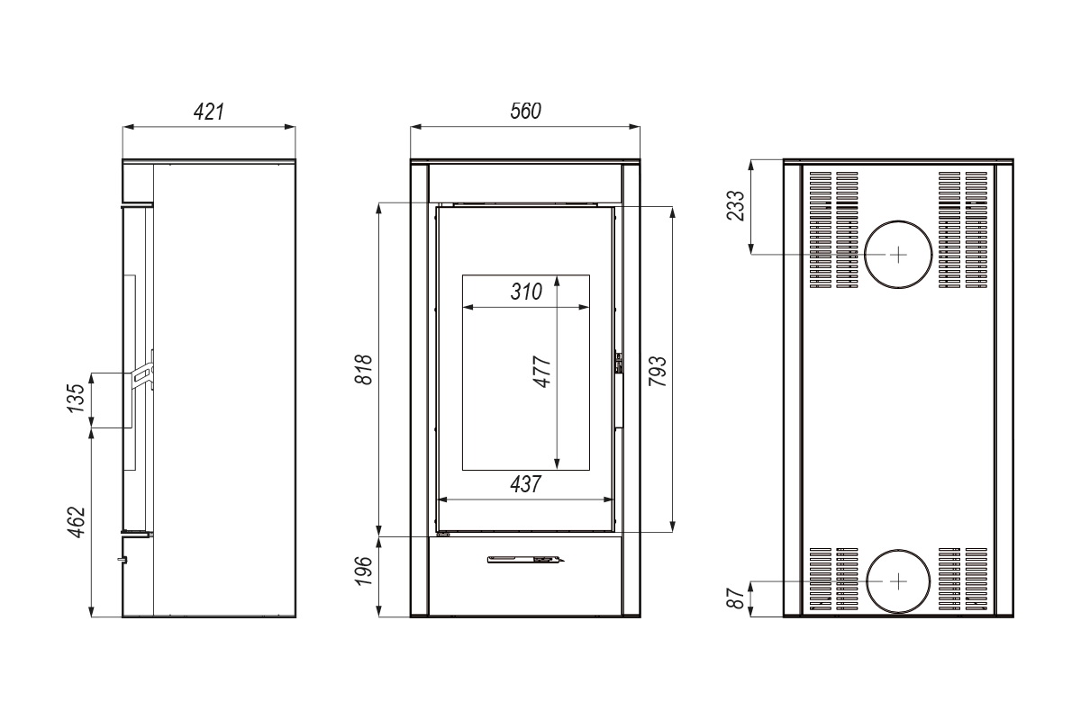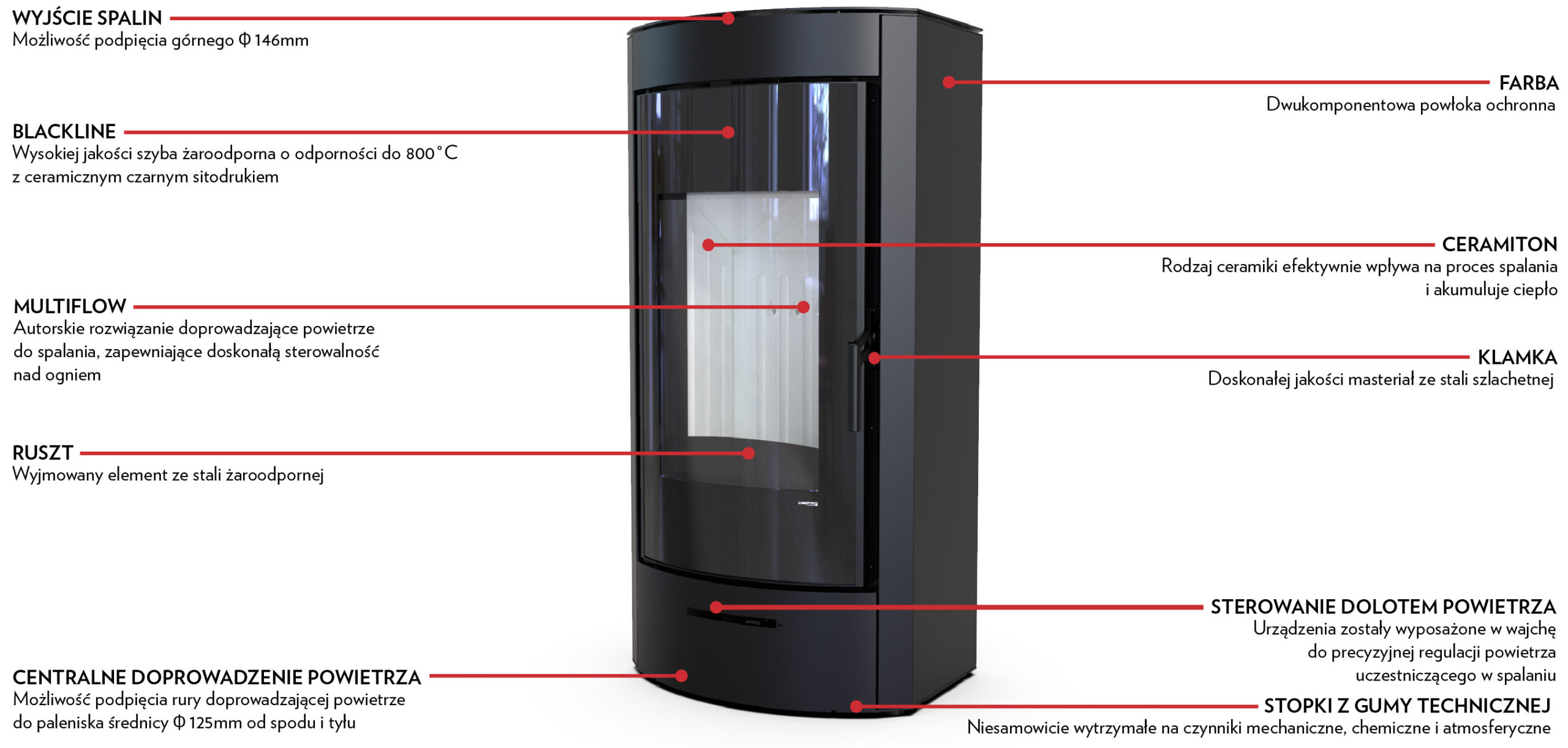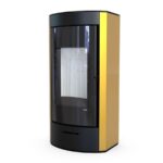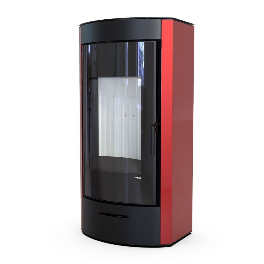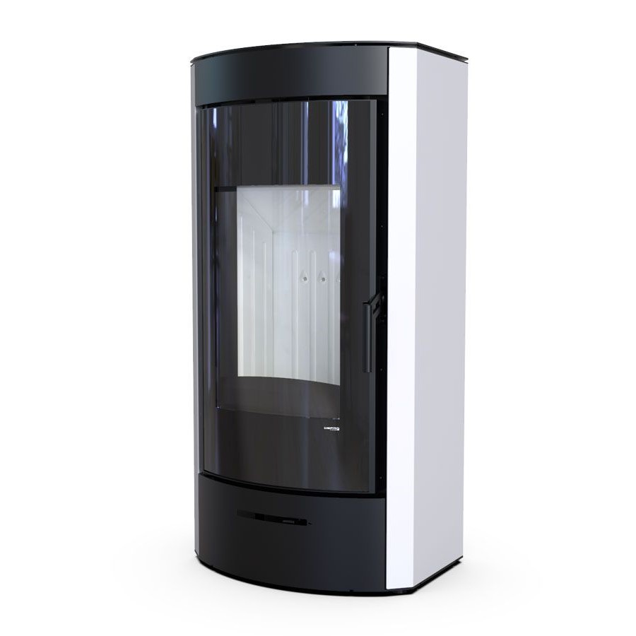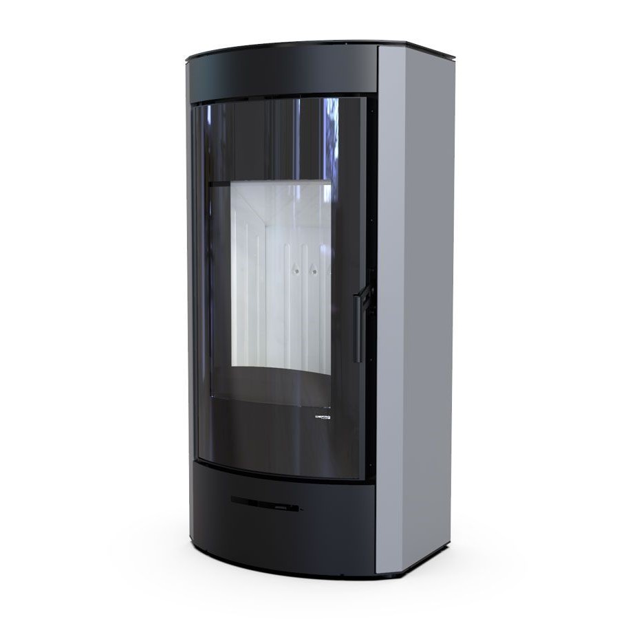 Wertykalnie położona szyba drzwi pozwala wydobyć piękną wizję ognia. Efektowne zagięcia na froncie piecyka tworzą ramę wokół widocznego paleniska, dające całości ciepłego wrażenia. Nowoczesna i zwarta obudowa podkreśla piękno i funkcjonalność tego modelu. Możliwość doprowadzenia powietrza do paleniska od spodu i tyłu pieca.
