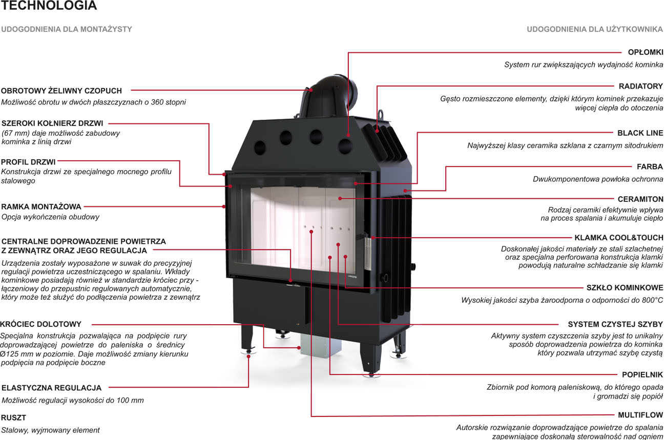 Kominek w standardzie wyposażony w stalowy ruszt, który można w łatwy sposób zamienić na dedykowaną ceramiczną zaślepkę, zmieniając palenisko na bezrusztowe.